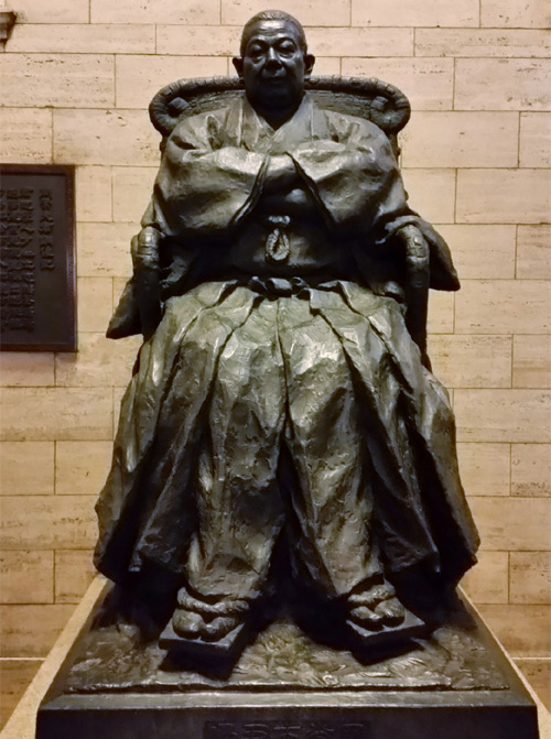 これは、東洋紡の元専務の岡常夫さんの銅像で、彼の寄付によってこの会館が建ちました。