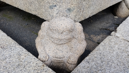 巨大な天水鉢(大屋根の雨水を受ける石の水槽)は4つの天の邪鬼(あまのじゃく)が支えています。