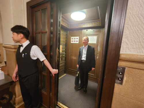百年前のエレベーターに乗って大西実行委員長がお帰りです。