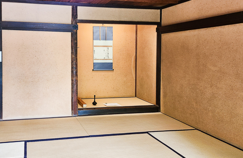 2階建てで1階は十畳の広間の茶室、3畳の小間の茶真、その間に7畳半の中板の小間からなっています。