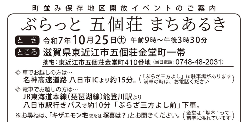 恒例の近江商人発祥の地、五個荘金堂町の開放イベントのご招待です。