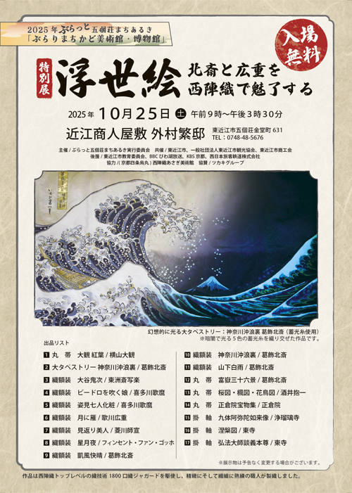 西陣織あさぎ美術館の移動展「浮世絵~北斎と広重を西陣織で魅了する~」を近江商人屋敷「外村繁邸」で開催(無料)しています。
