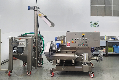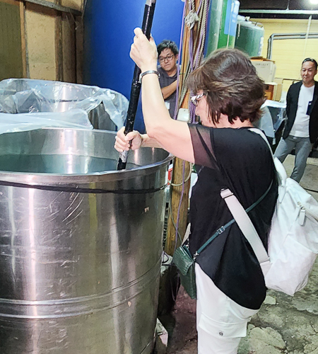 櫂(かい)入れの実習、家内が櫂(かい、醸造した酵母をかきまぜる)を使う