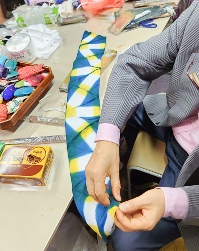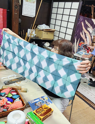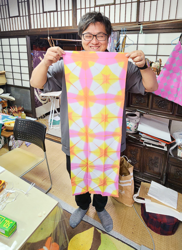 手ぬぐいを板切れではさんで、染をすると絞り染めように絵柄が出てくるのです。