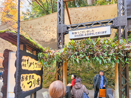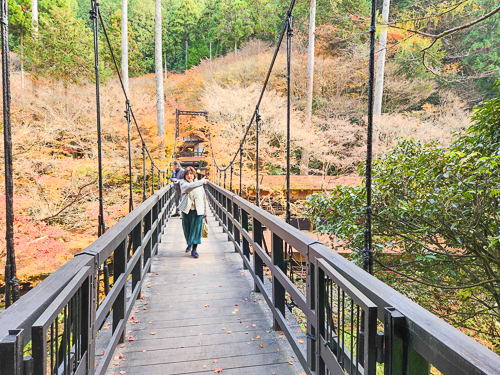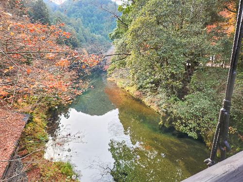 高雄に到着すると清滝川に吊り橋が掛かり、川の向こうに「もみぢ家別館」があります。
