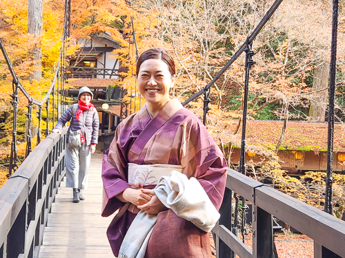 橋の上で、玉垣多佳子さん(十四春旅館の若女将)