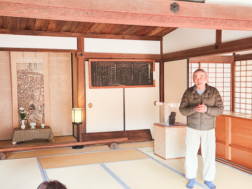 ご住職の左の掛け軸は、「明恵上人・樹上座禅像」(国宝)です。