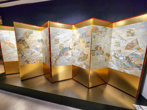 俵屋宗達の豪快な扇面流図の屏風(西陣織あさぎ謹製)