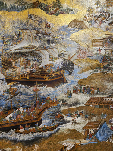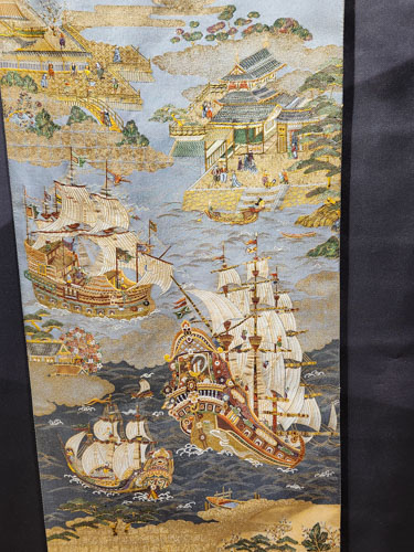 「南蛮船来航の図」、堺の浜に南蛮人がやってきました。(加賀友禅の木村州宏先生作のパノラマ)