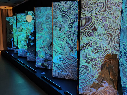 「日月山水図」の蓄光糸の屏風・・・ブラックライトでイリュージョンの世界