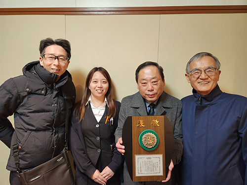 実は1月21日の夕刻にホテルで表敬式がありこの表敬盾を頂戴し、夜にツカキ㈱に戻ったら経理の門井部長と田井中リーダーが残業で帰る間際で、コートをきたままの記念撮影となりました。実にうれしく喜びを分かち合いました!(^^)!