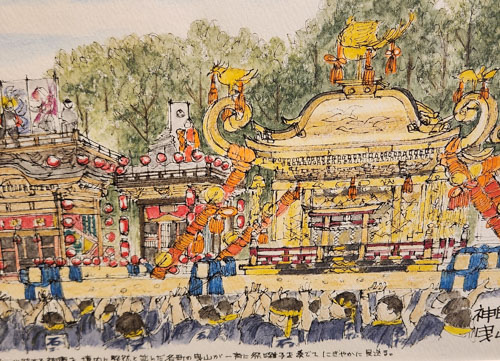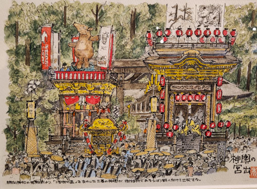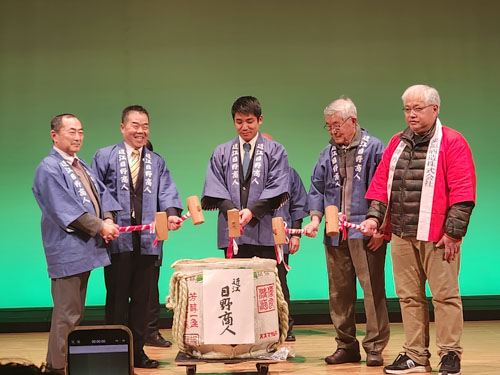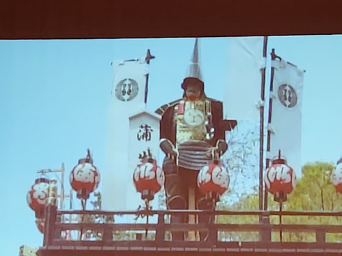 町民会館の舞台では大歓迎のしるしに有名な日野祭の曳山囃子方(ひきやま・はやし)の演奏で盛り上がりました。