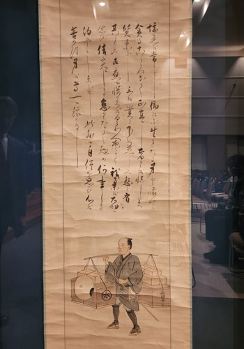 日野の豪商、細田善兵衛の半襟(はんえり、着物のえりに掛ける布)の行商の像(明治16年)