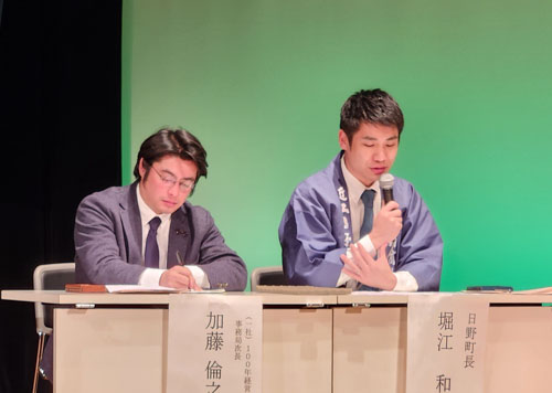 左から小生、堀江町長、北野副理事長(NPO三方よし研究所)