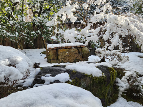 小さな築山の古井戸の井桁・石組にも積雪です。