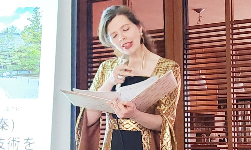 西陣織あさぎ美術館のスタッフで、ウクライナ人のユリヤ・ボンダレンコさんが頑張っています。彼女はウクライナ語、ロシア語、ドイツ語、英語、日本語を自由に話します。彼女はとても日本文化に詳しく日本語は標準語、丁寧語、関西弁も操ります。