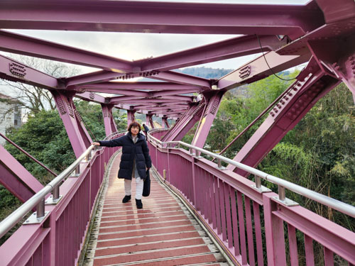 少し歩くと上口昌徳さんが招請した勅使河原宏(草月流3代目)さんが設計した「あやとり橋」があり、S字型をしたユニークなワインレッドの橋です。
