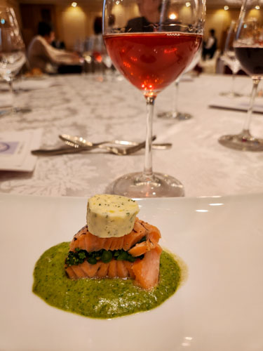サーモンとサンギュリオ(特異な)ワイン・・・なんというか複雑なお味のワインでございました。